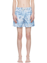 Polyester taffeta swim shorts. Graphic printed throughout. · Drawstring at elasticized waistband · Three-pocket styling · Metal eyelet and logo flag at back pocket · Briefs-style mesh lining Supplier color: Indigo blue