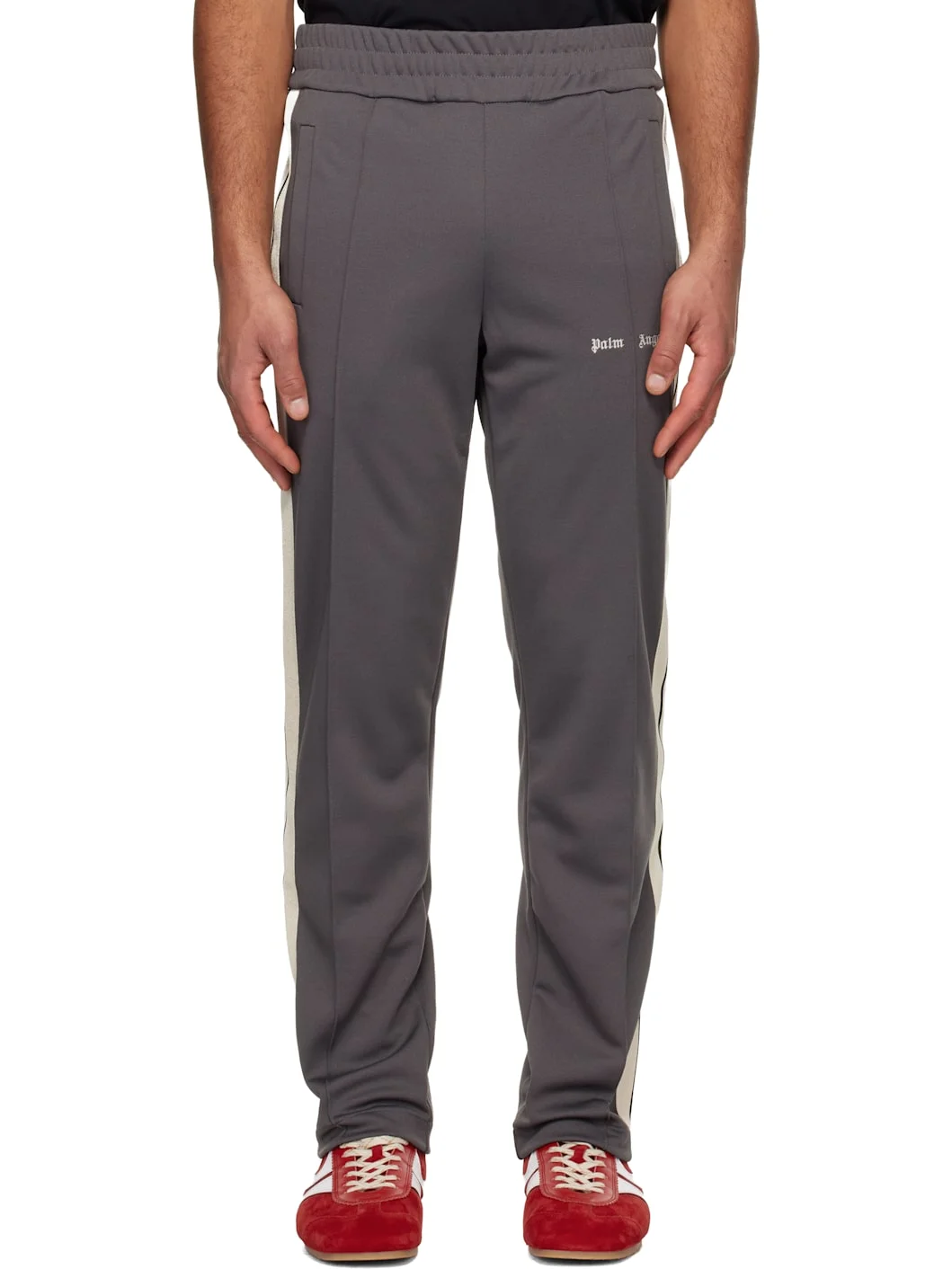 Interlock jersey track pants. · Straight-leg · Elasticized waistband · Two-pocket styling · Logo embroidered at front · Pinched seam at front legs · Zip vent at cuffs · Striped knit trim at outseams Supplier color: Grey/Off white 100% polyester. Made in Portugal 252695M190004