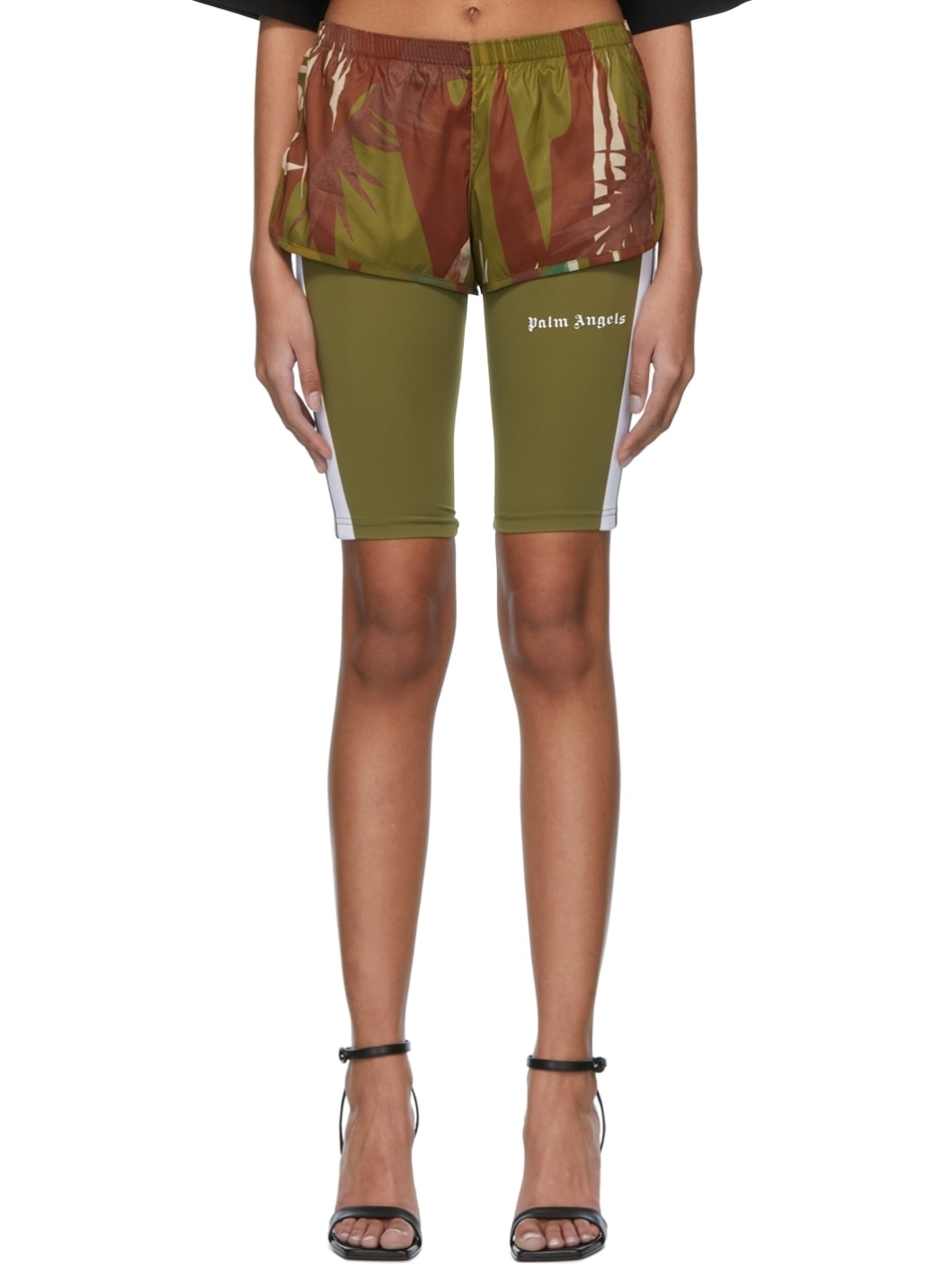 Polyester satin shorts. Stretch jersey short-style underlay. · Elasticized waistband · Logo printed at front · Stripes at outseams · Graphic printed throughout Supplier color: Military green Body: 90% polyester, 10% elastane. Lining: 80% polyester, 20% elastane. Detail: 100% polyester.