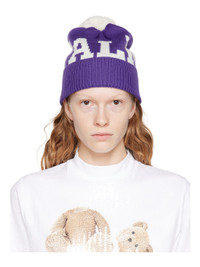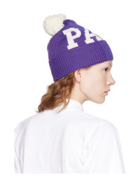 Knit acrylic and wool-blend beanie in purple. Jacquard logo in white throughout. · Pom-pom applique at crown · Rib knit rolled brim Supplier color: Purple/White 50% acrylic, 50% wool. Made in Italy 222695F014013