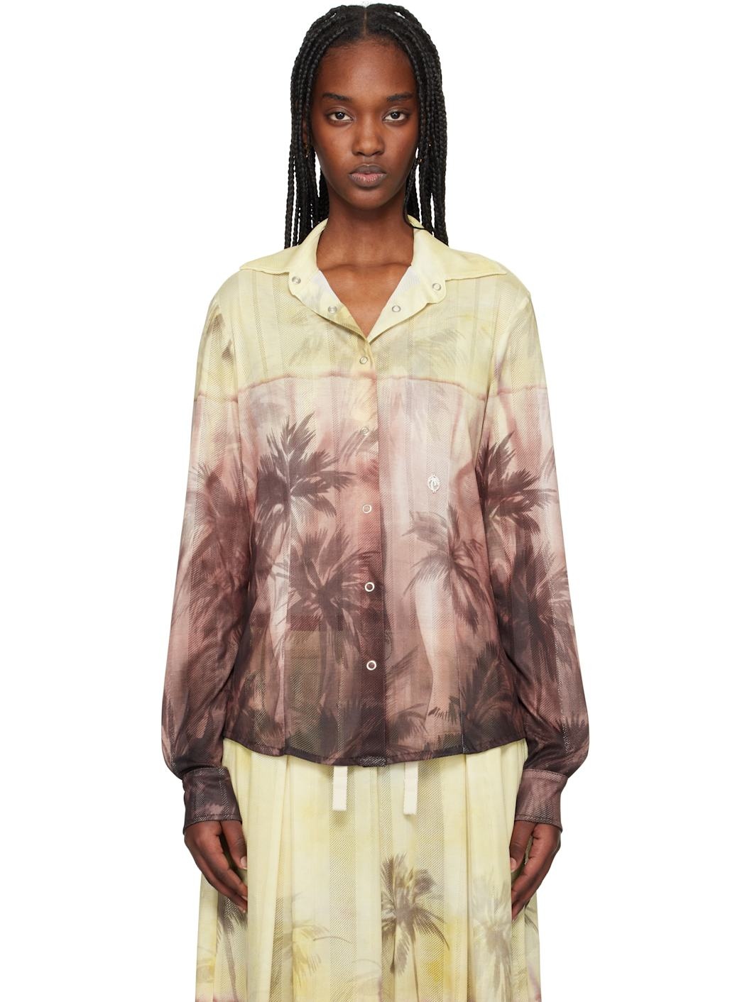 Semi-sheer polyester mesh shirt. Graphic pattern printed throughout. · Spread collar · Press-stud closure · Logo hardware at front · Shirttail hem · Pleat at single-press-stud barrel cuffs · Darts at back · Silver-tone brass hardware Supplier color: Orange/Black Body 1: 100% polyester. Body 2: 100% polyester. Trim: 100% brass. Made in Italy 251695F109000