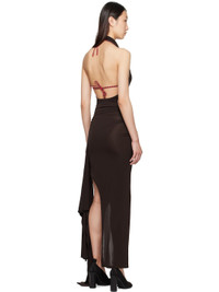 Semi-sheer stretch viscose jersey maxi dress. · FSC-certified viscose · Cowl neck · Ruching at sides · Slit and extended ruffled trim at hem · Open back Supplier color: Brown 92% viscose, 8% elastane. Made in Portugal 252648F055003