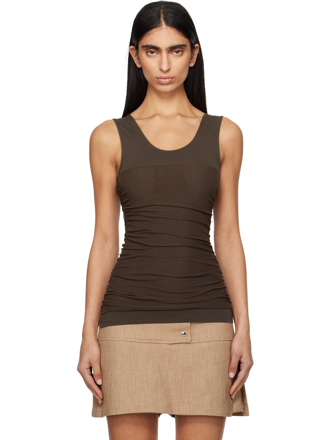 Stretch organic cotton jersey tank top. Sheer recycled polyester mesh overlay. · Scoop neck · Ruching, gathering, and raw edges at overlay Supplier color: Brown Body 1: 94% organic cotton, 6% elastane. Body 2: 100% recycled polyester. Made in Portugal 251648F111017