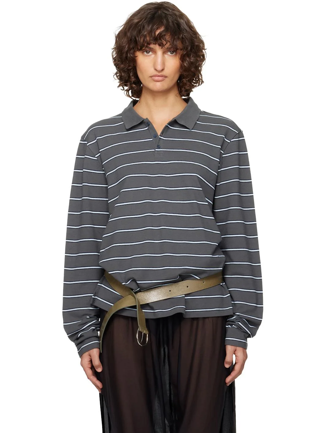 Organic cotton pique polo. · Stripes throughout · Rib-knit spread collar · Three-button placket · Vented side seams · Eyelets at armscyes · Locker loop at back collar Supplier color: Light grey 100% organic cotton. Made in Portugal 261648F108000