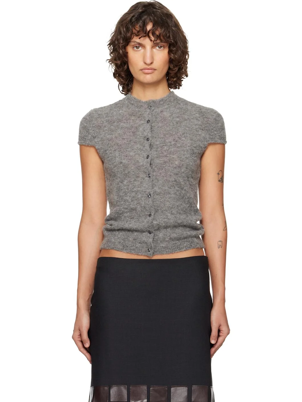 Knit alpaca- and recycled nylon-blend cardigan. · Rib-knit crewneck, hem, and cuffs · Button closure · Cap sleeves Supplier color: Grey 75% alpaca, 24% recycled nylon, 1% nylon. Made in Spain 261648F095004