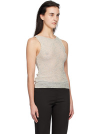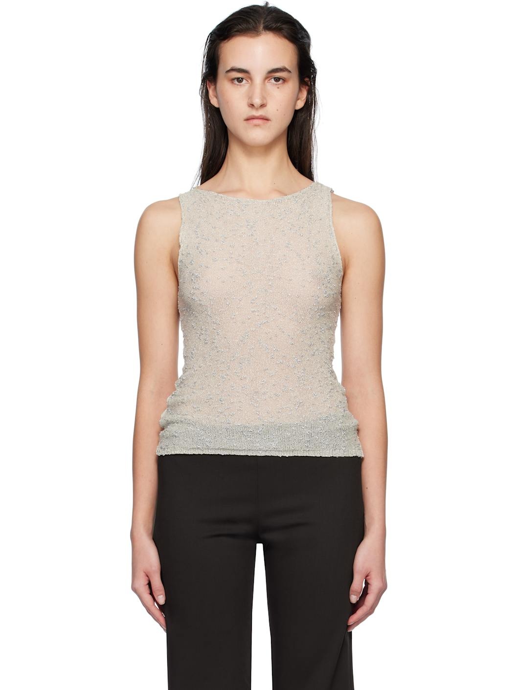 Semi-sheer knit viscose-blend tank top. Metallic thread detailing throughout. · Rolled edge at crewneck and armscyes · Rib-knit hem Supplier color: Silver 63% viscose, 20% metalized fibre, 17% nylon. Made in Spain 251648F111011