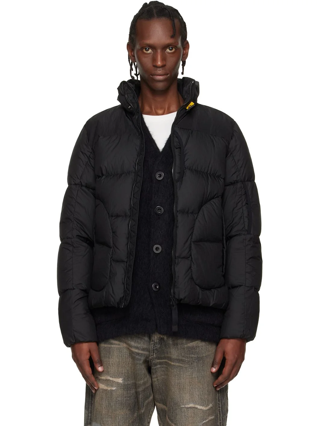 Down-filled cotton poplin jacket. · Water-repellent and windproof · Stowaway hood at stand collar · Bungee-style drawstring at hood and hem · Press-stud tab at collar · Zip closure with press-stud placket · Welt pockets at front · Logo patch at sleeve · Adjustable press-stud tab at cuffs · Detachable shoulder-straps at interior · Mesh flap pockets at interior · Fully lined Supplier color: Black phantom Body: 100% cotton. Trim 1: 100% nylon. Trim 2: 100% polyester. Fill 1: 100% duck down. Fill 2: 100% polyester. Lining: 100% nylon. Made in Indonesia 261048M178014