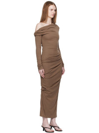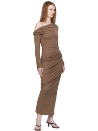 Merino wool jersey midi dress. · ZQ-certified merino wool · Draping throughout · Single-shoulder construction · Twisted detailing at shoulder · Gathering at sides · Vented side seam Part of the Elemental 06 collection. Supplier color: Chestnut 100% merino wool. Made in New Zealand 252438F054020