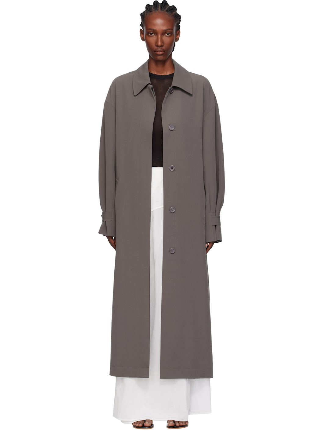 Stretch twill trench coat. · Spread collar · Button closure · Welt pockets at front · Adjustable button tab at cuffs · Bungee-style drawstring at back · Central vent at back hem · Welt pockets at interior · Full satin lining Supplier color: Charcoal Body: 75% triacetate, 18% rayon, 7% spandex. Lining: 100% viscose. Made in New Zealand 252438F067003