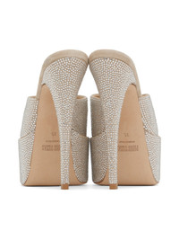 Suede heeled sandals in beige. Crystal-cut accents throughout. · Open square toe · Fixed strap at vamp · Grained leather footbed · Stiletto heel with rubber injection · Covered platform midsole · Leather outsole · Platform: H2 in · Heel: H5.5 in Supplier color: Quartz Leather. Made in Italy 222616F125045