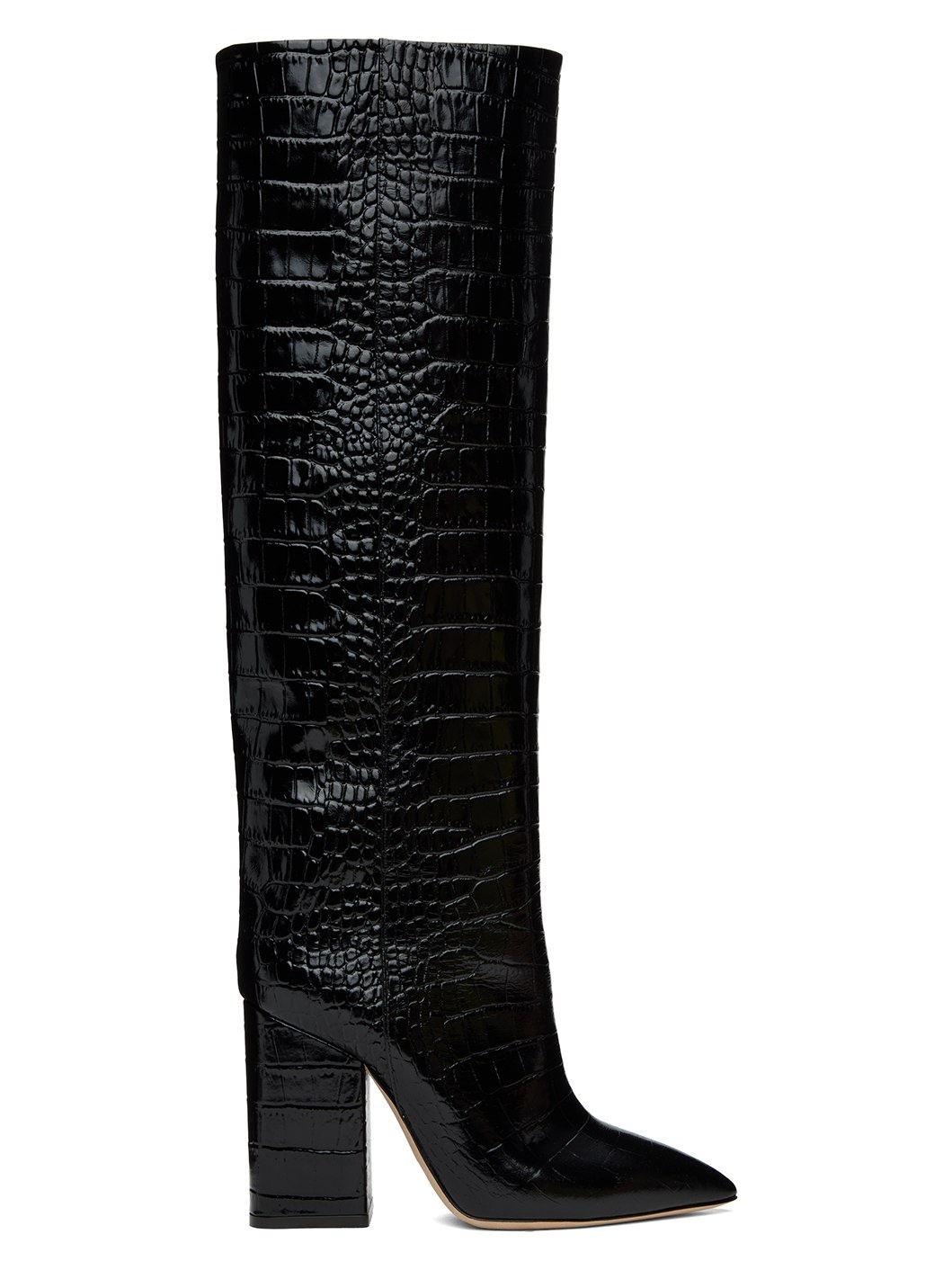 Knee-high croc-embossed leather boots in black. · Pointed toe · Grained leather lining · Covered block heel with rubber injection · Leather sole · Heel: H3.25" Supplier color: Carbone Upper: leather. Sole: leather, rubber. Made in Italy 242616F115012