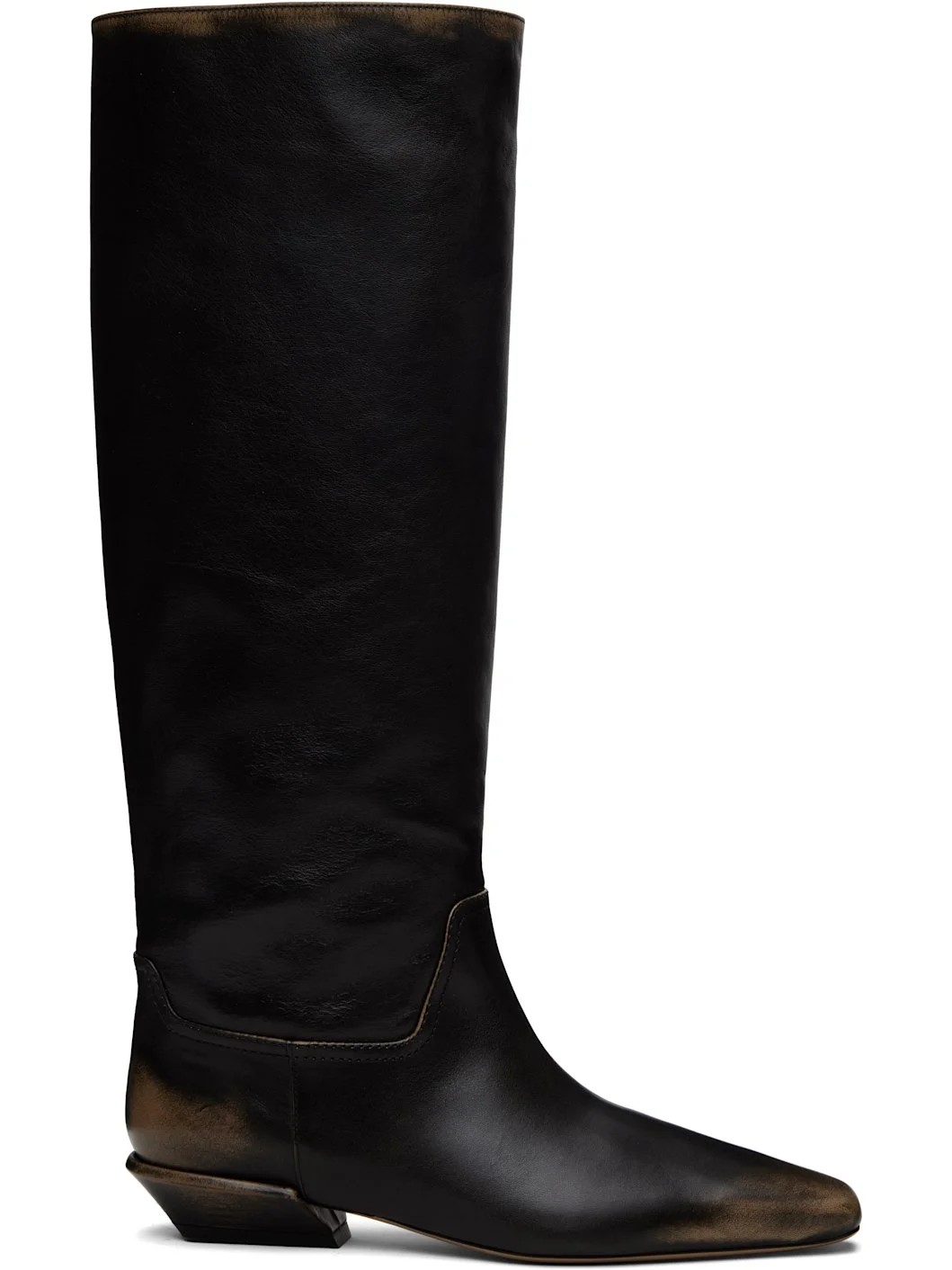 Knee-high grained leather slip-on boots. · Fading at pointed square toe and heel · Grained leather lining · Stacked leather heel · Leather sole Supplier color: Black Upper: leather. Sole: leather. Made in Italy 252616F115026