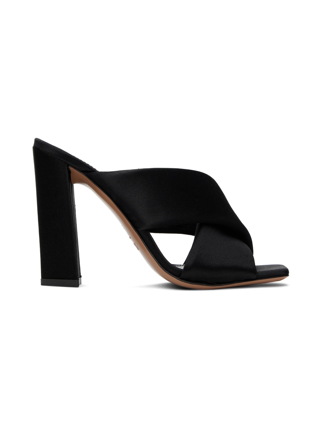 Satin heeled sandals in black. · Open square toe · Padded criss-crossing straps at vamp · Logo embossed at padded leather footbed · Grained leather lining · Covered block heel with rubber injection · Leather sole · Heel: H4" Supplier color: Black Upper: textile. Sole: leather. Made in Italy 241616F125020