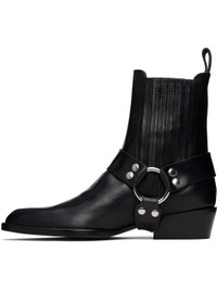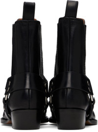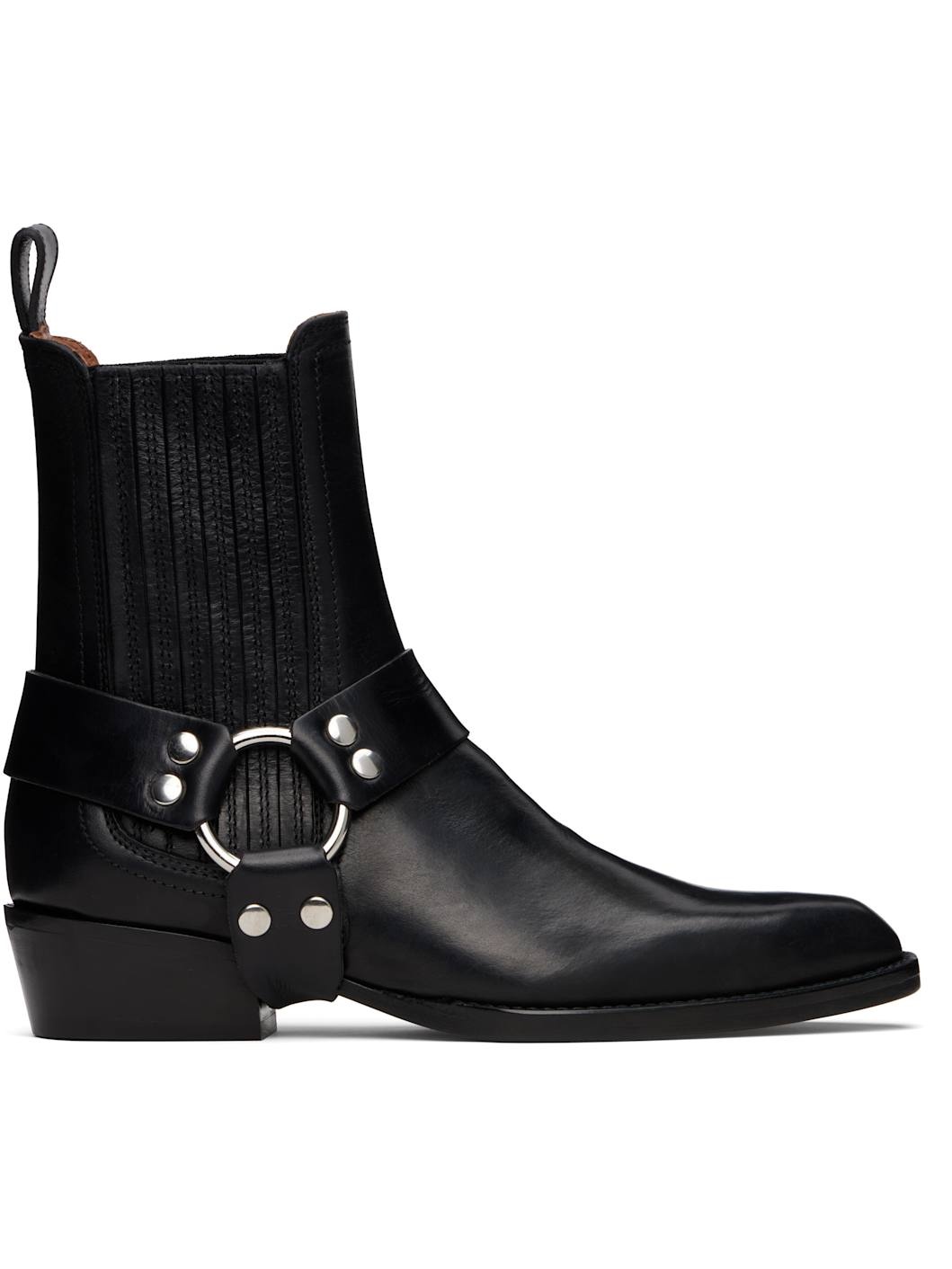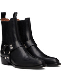 Ankle-high buffed calfskin boots in black. · Pointed square toe · Elasticized gusset at sides · Harness-style straps at sides · Pull-loop at heel collar · Buffed leather lining · Stacked leather block heel with rubber injection · Leather sole · Heel: H1.5" Supplier color: Black Upper: calfskin. Sole: leather, rubber. Made in Italy 252616F113006