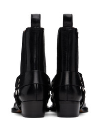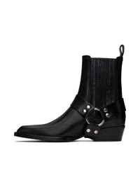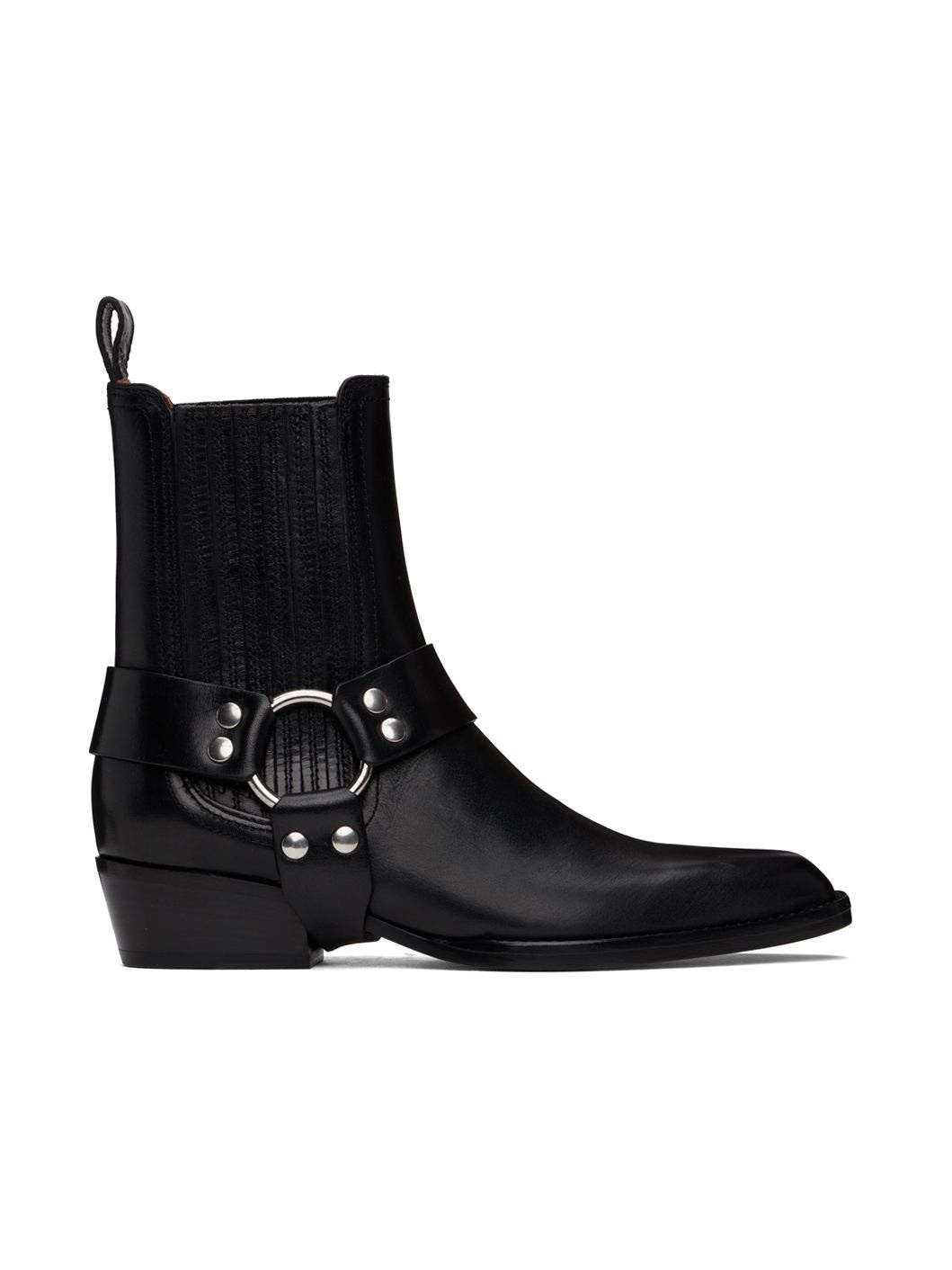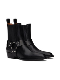 Ankle-high buffed calfskin boots in black. · Modified pointed toe · Elasticized gusset at sides · O-ring and studs at sides · Pull-loop at heel collar · Buffed leather lining · Topstitching at welt · Stacked block heel with rubber injection · Calfskin sole with rubber injection · Heel: H1.5" Supplier color: Black Calfskin. Made in Italy 242616F113001