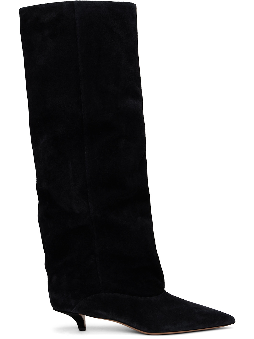 Knee-high calfskin suede boots in black. · Pointed toe · Grained leather lining · Covered kitten heel with rubber injection · Leather sole · Heel: H1.5" Supplier color: Off black Upper: calfskin. Sole: leather, rubber. Made in Italy 242616F115021