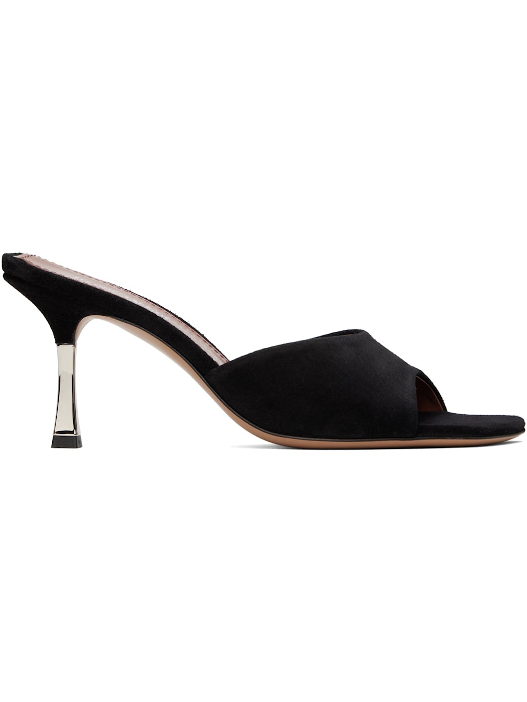 Calfskin suede mules in black. · Open square toe · Logo stamp at padded leather footbed · Galvanized stiletto heel with rubber injection · Leather sole · H2.75" Supplier color: Black Upper: calfskin. Sole: leather. Made in Italy 251616F125005