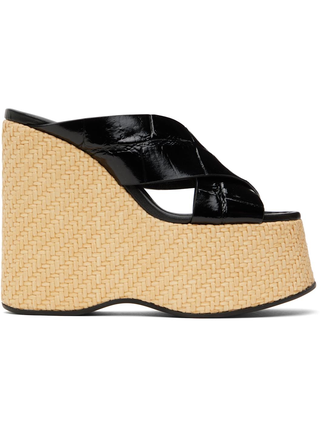 Croc-embossed patent leather mules in black. · Open square toe · Crisscrossing straps at vamp · Logo stamp at buffed leather footbed · Woven raffia-covered platform midsole and wedge heel · Smooth rubber sole · Platform: H2" · Heel: H5.5" Supplier color: Black/Natural Upper: leather. Sole: cork, rubber. Made in Italy 251616F125020