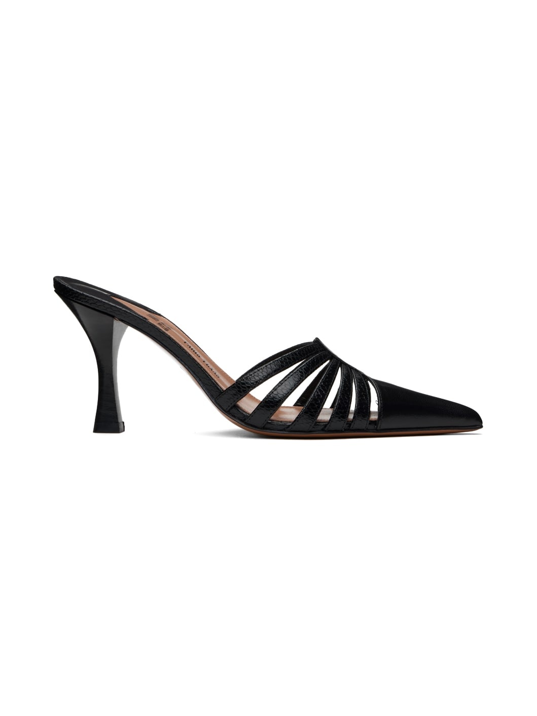 Snake-embossed leather slip-on mules in black. · Pointed toe · Cutouts at vamp · Logo stamp at grained leather footbed · Stacked leather stiletto heel · Leather sole with rubber injection · Heel: H3.5" Part of the Paris Texas Nadia Lee Cohen capsule collection. Supplier color: Black Upper: leather. Sole: leather, rubber. Made in Italy 241616F122004