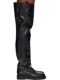 Over-the-knee grained calfskin boots. · Pull-loops at collar · Buffed leather lining · Leather sole with rubber injections · Stacked leather block heel · Heel: H1.5" Supplier color: Black Upper: calfskin. Sole: leather, rubber. Made in Italy 252616F116001