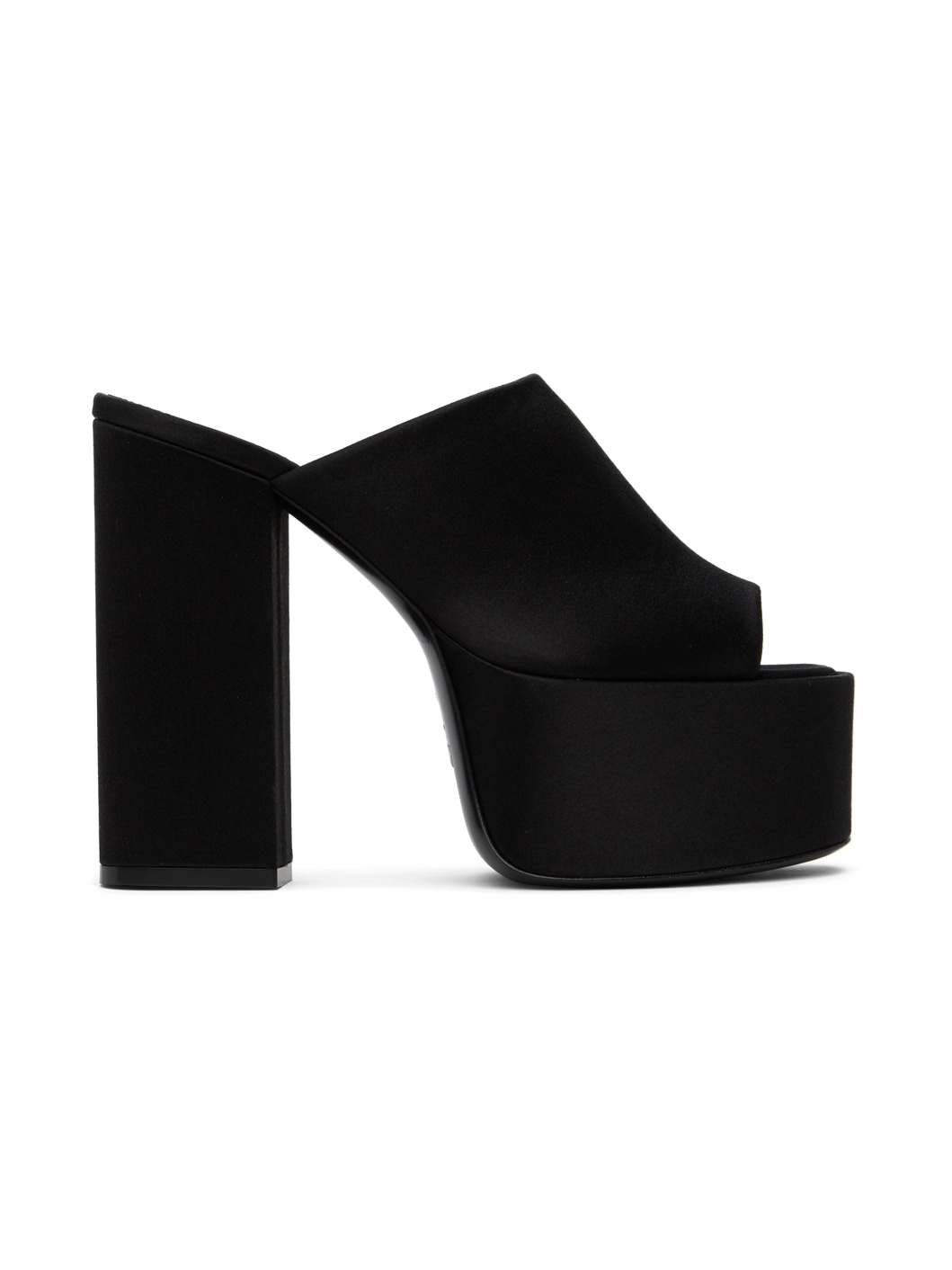 Satin heeled sandals in black. · Open square toe · Logo printed at buffed leather footbed · Covered block heel with rubber injection · Leather sole · Platform: H2 in · Heel: H5 in Supplier color: Black Upper: textile, leather. Sole: leather, rubber. Made in Italy 231616F125024