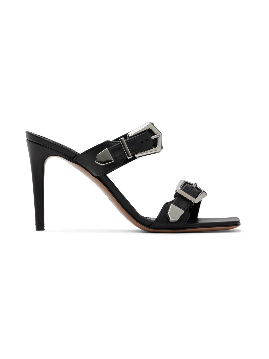 Buffed leather mules in black. · Open square toe · Pin-buckle straps at vamp · Silver-tone logo stamp at padded footbed · Covered stiletto heel with rubber injection · Leather sole · Heel: H3.5" Supplier color: Black Upper: leather. Sole: leather, rubber. Made in Italy 241616F125006