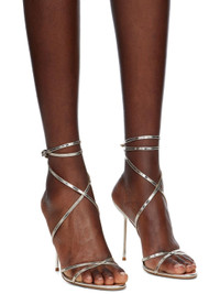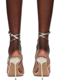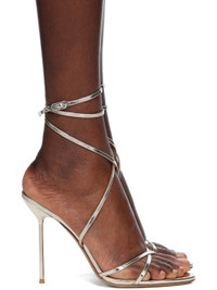 Patent leather heeled sandals in gold tone. · Open toe · Crisscrossing straps at vamp · Wraparound pin-buckle ankle strap · Logo embossed at leather footbed · Covered stiletto heel with rubber injection · Leather sole · Heel: H4.5" Supplier color: Gold Leather. Made in Italy 251616F125012
