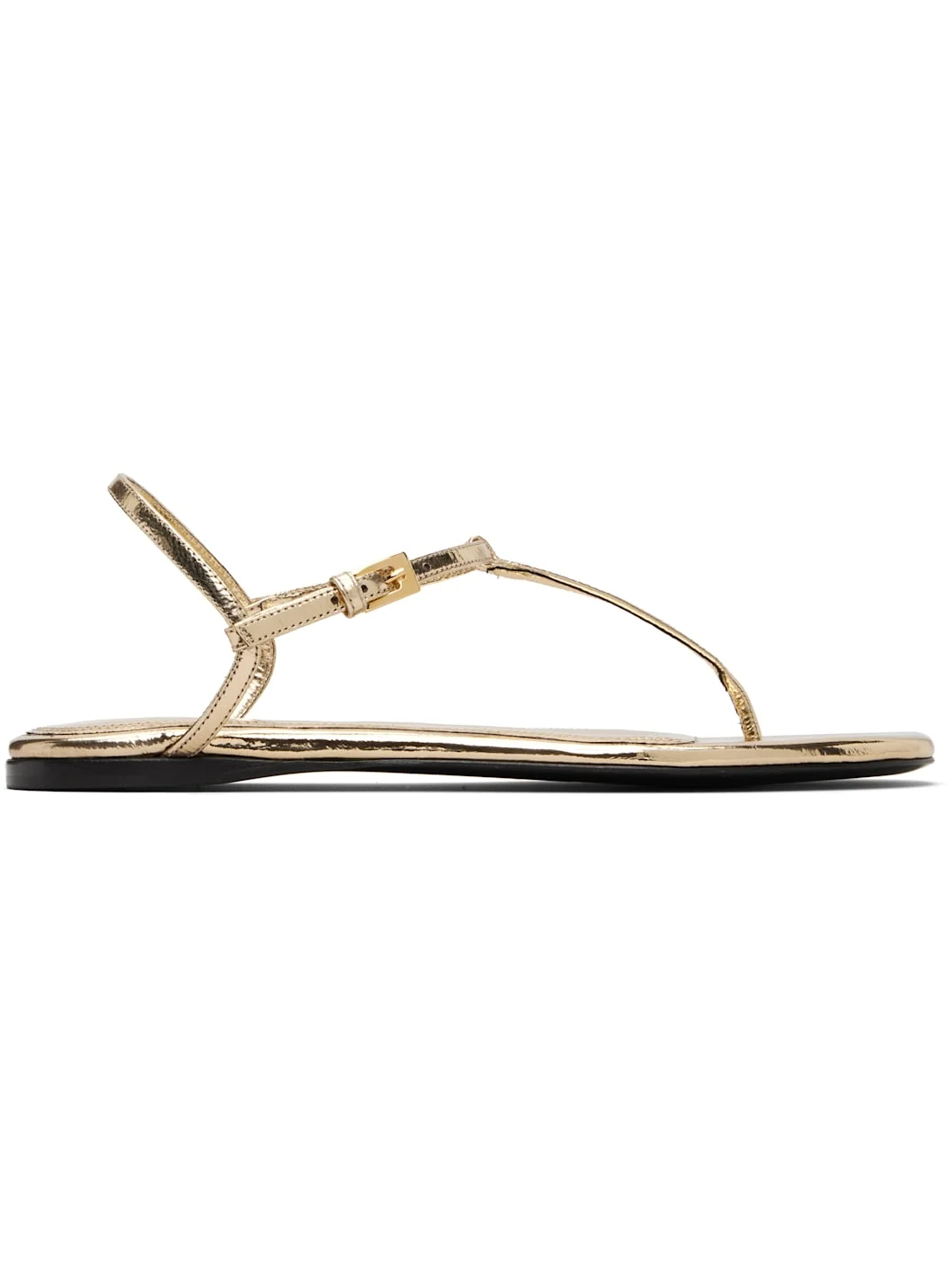 Crinkled patent leather flat sandals. · Open toe · Thong-style strap at vamp · Pin-buckle ankle strap · Logo embossed at padded footbed · Polished leather sole with rubber injection Supplier color: Gold Leather. Made in Italy 261616F124000