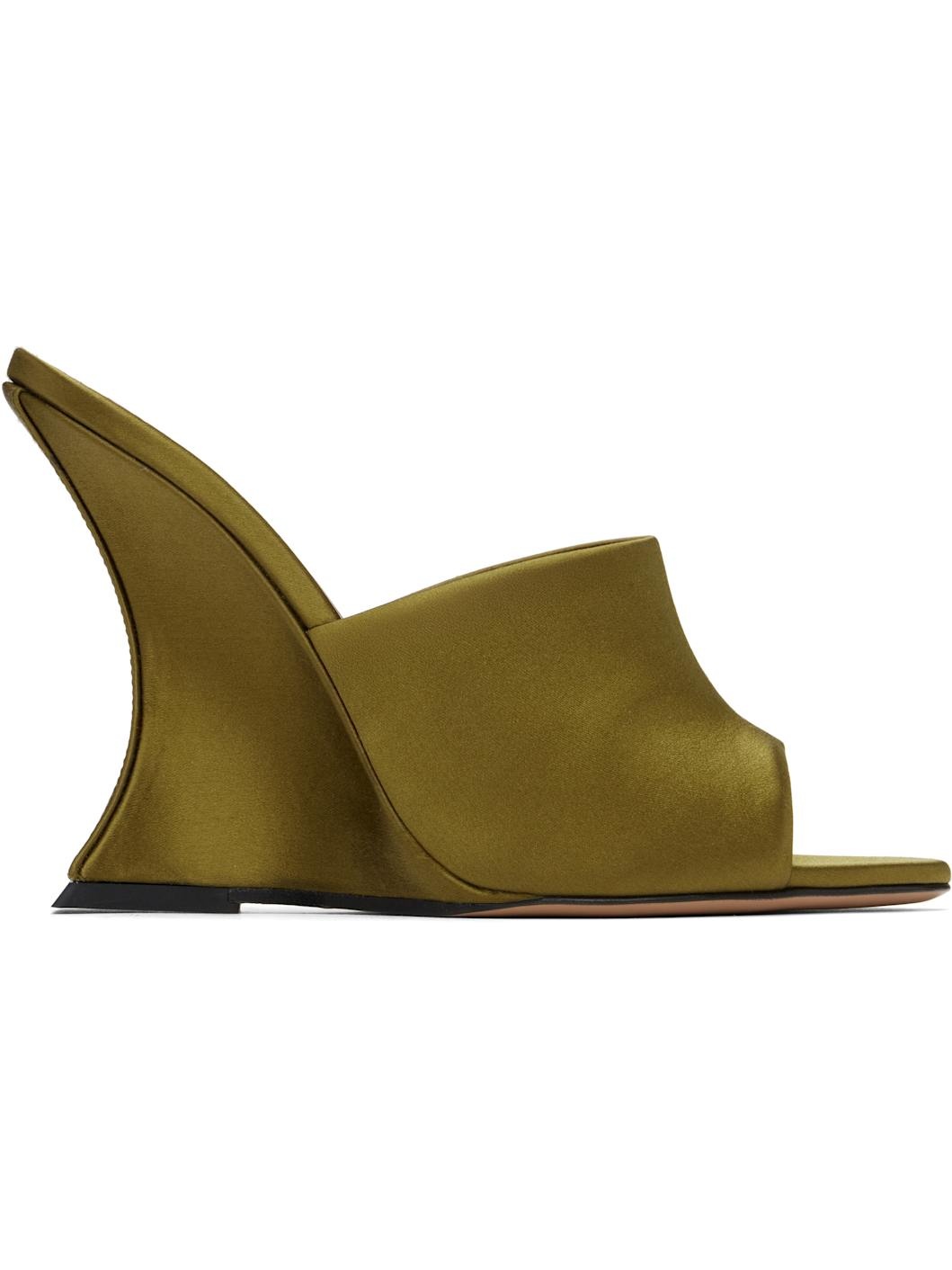 Satin heeled sandals in khaki. · Grained leather lining · Logo stamp at leather footbed · Covered wedge heel with rubber injection · Leather sole · Heel: H4" Supplier color: Oil Upper: textile. Sole: leather, rubber. Made in Italy 251616F125002