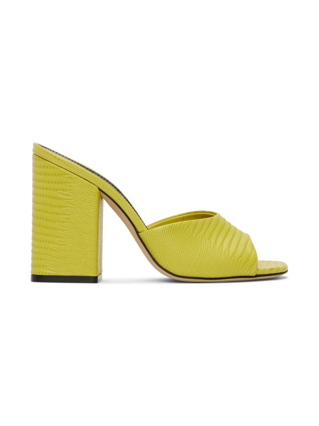 Reptile-embossed leather heeled sandals in yellow. · Open square toe · Logo stamp at leather footbed · Covered block heel with rubber injection · Leather sole · Heel: H4 in Supplier color: Acid Leather. Made in Italy 231616F125058