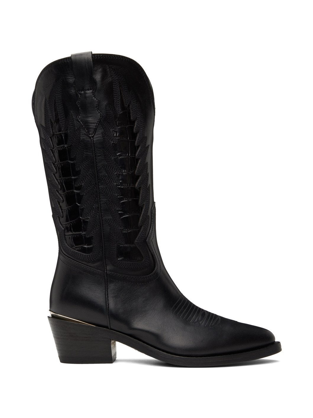 Handcrafted mid-calf vegetable-dyed buffed calfskin boots in black. · Pointed toe · Embroidered detailing at vamp and sides · Pull-loops at collar · Inset croc-embossed calfskin panels at sides · Logo plaque at heel counter · Padded insole · Stacked leather block heel with rubber injection · Leather sole · Heel: H2.25" Supplier color: Nero Upper: calfskin. Sole: leather, rubber. Made in Italy 241229F114003