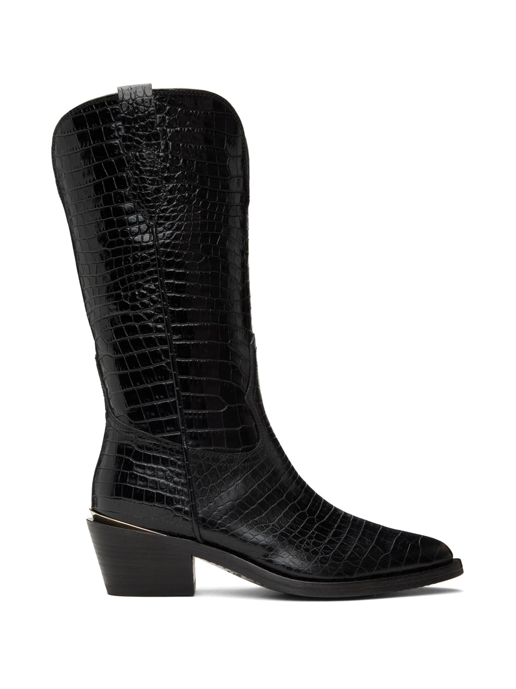 Handcrafted mid-calf croc-embossed calfskin boots in black. · Pointed toe · Pull-loops at collar · Logo plaque at heel counter · Padded insole · Buffed leather lining · Stacked leather block heel with rubber injection · Leather sole · Heel: H2.25" Available exclusively at SSENSE. Supplier color: Nero Upper: calfskin. Sole: leather, rubber. Made in Italy 241229F114012