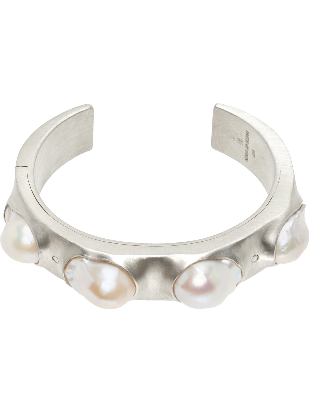 Open cuff bracelet in sterling silver. · Bezel-set baroque pearls at face · D3" Supplier color: Matte sterling silver 925 sterling silver. Made in Indonesia 252236M142005