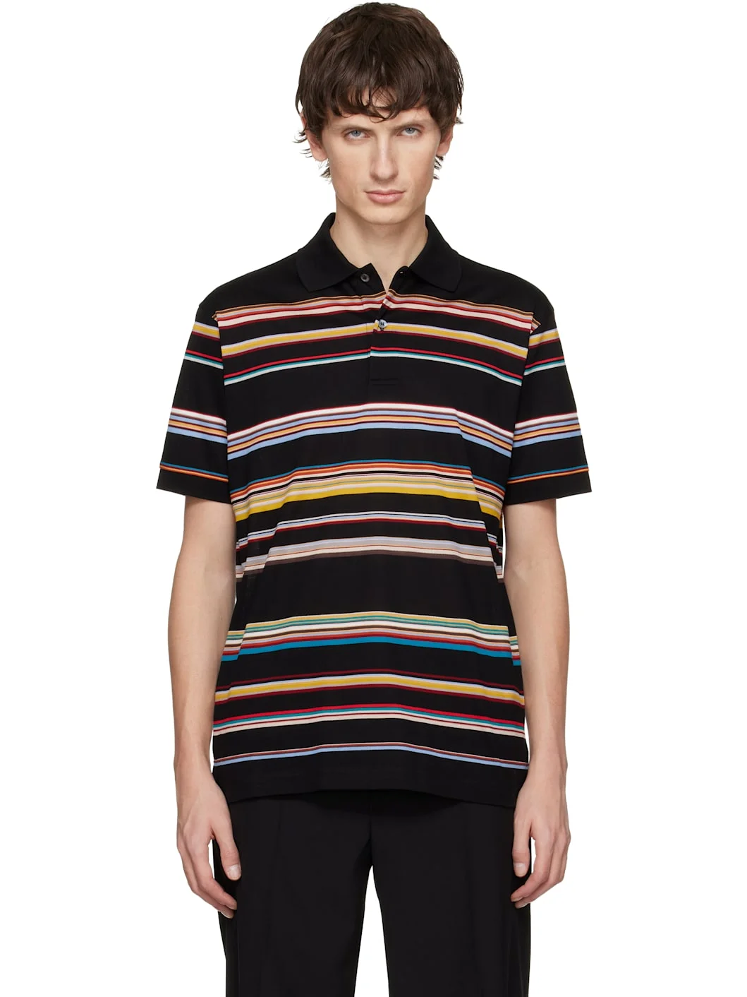 Cotton pique polo. · Jacquard signature stripes throughout · Rib-knit spread collar and cuffs · Two-button placket · Tennis-tail hem Supplier color: Black 100% cotton. Made in Italy 252260M212003