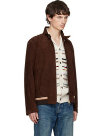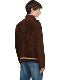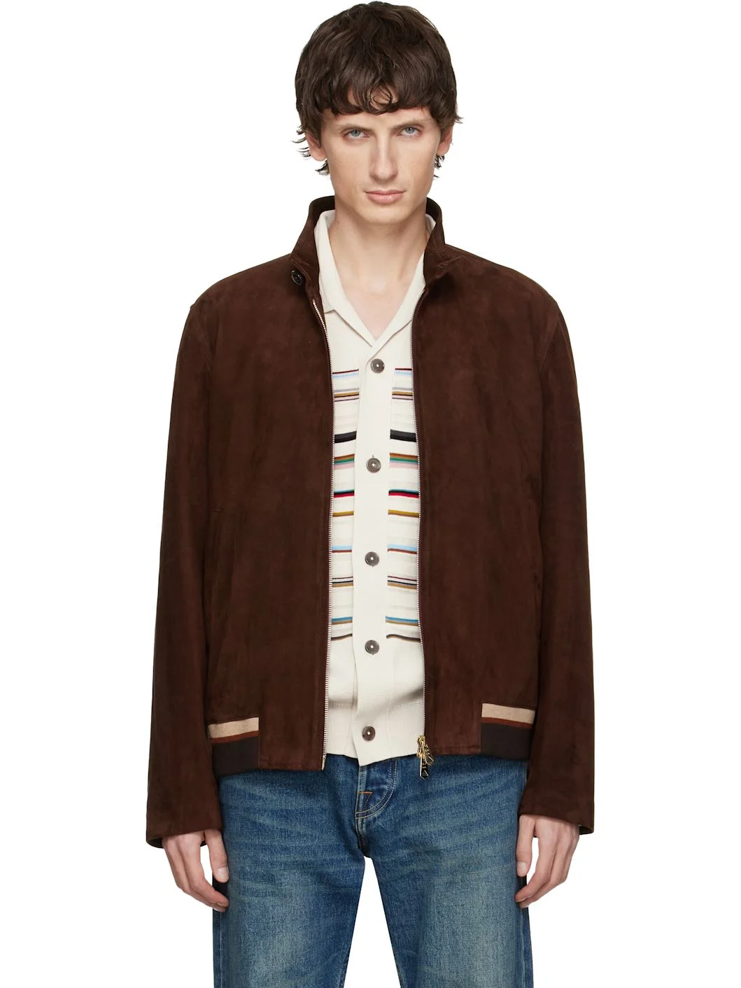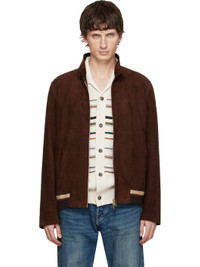Suede jacket. · Button fastening at funnel neck · Two-way zip closure · Welt pockets at front · Striped rib-knit hem · Adjustable press-stud tab at cuffs · Rivets at back collar · Welt pockets at interior · Full satin lining Supplier color: Brown Body: 100% leather. Trim: 100% cotton. Lining: 100% viscose. Made in Italy 252260M181000