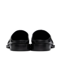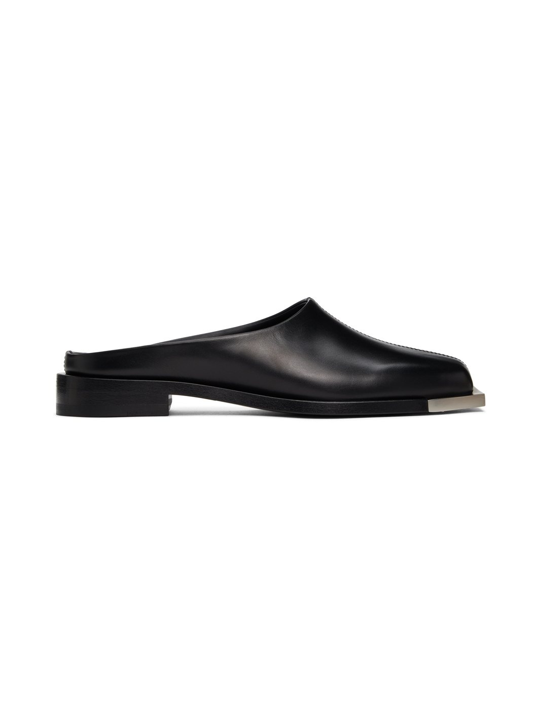 Buffed leather slip-on loafers in black. Metal trim in matte silver-tone at square toe. Logo stamp in silver-tone at black buffed leather footbed. Stacked leather heel. Leather outsole in black. Supplier color: Black/Silver Leather. Made in Italy 211462F121031