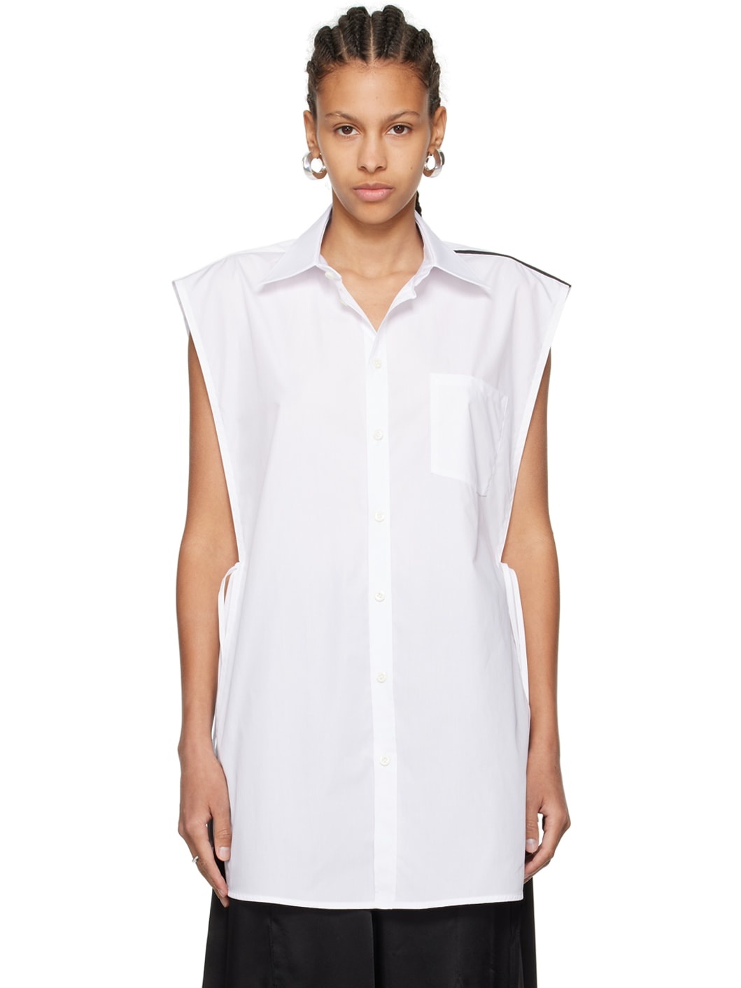Cotton poplin vest-style shirt. · Spread collar · Button closure · Patch pocket · Shirttail hem · Self-tie fastening at open side seams Supplier color: White 100% cotton. Made in United States 242462F109001