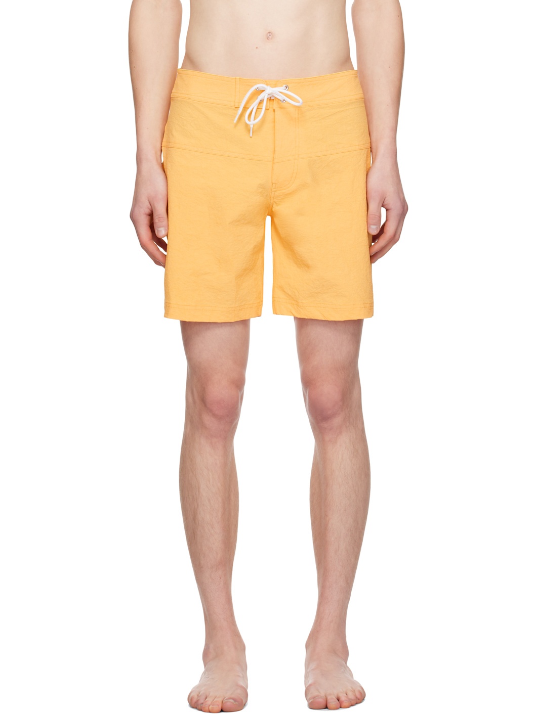 Coated nylon taffeta swim shorts. · Drawstring at waistband · Button-fly · Logo embroidered at front · Darts at back waistband · Key loop at back flap pocket · Unlined Supplier color: Yellow 90% nylon, 10% polyurethane. Made in Japan 241972M193000