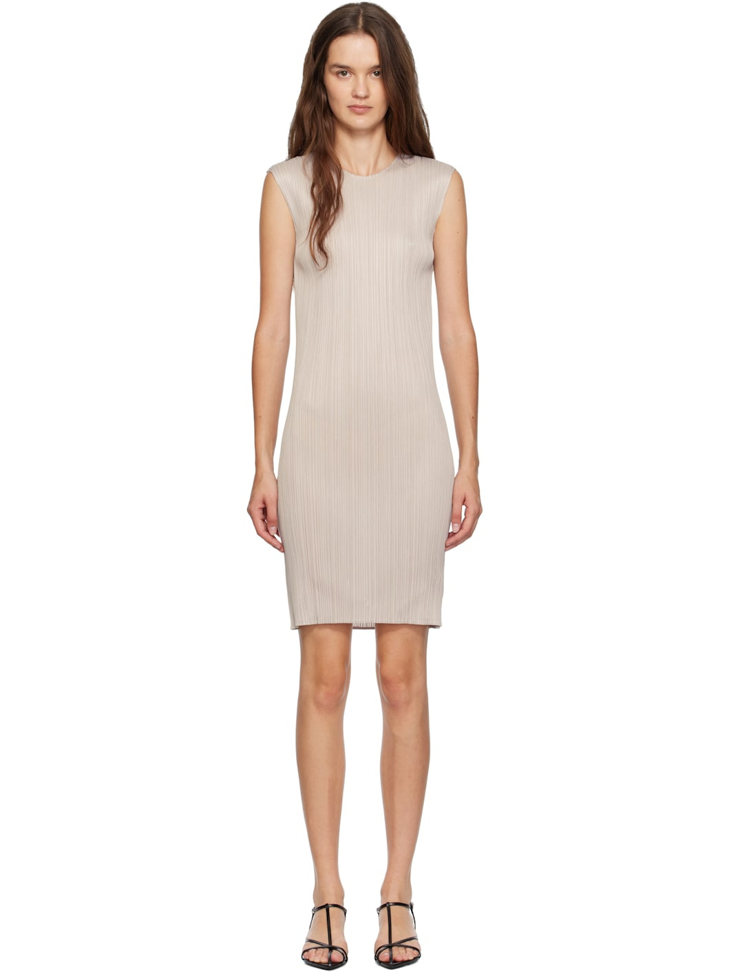 Garment-pleated polyester tricot midi dress. Round neck. Supplier color: Greige 100% polyester. Made in Japan 252941F054012