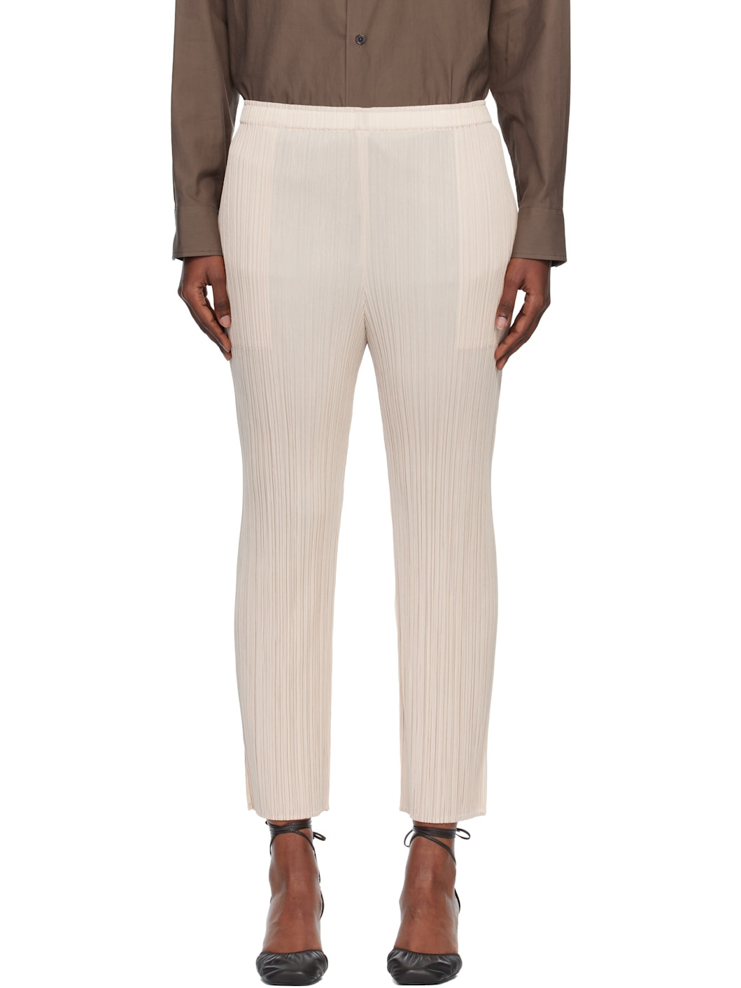 Garment-pleated tricot trousers. · Slim-fit · Elasticized waistband Supplier color: Light beige 100% polyester. Made in Japan 252941F087060