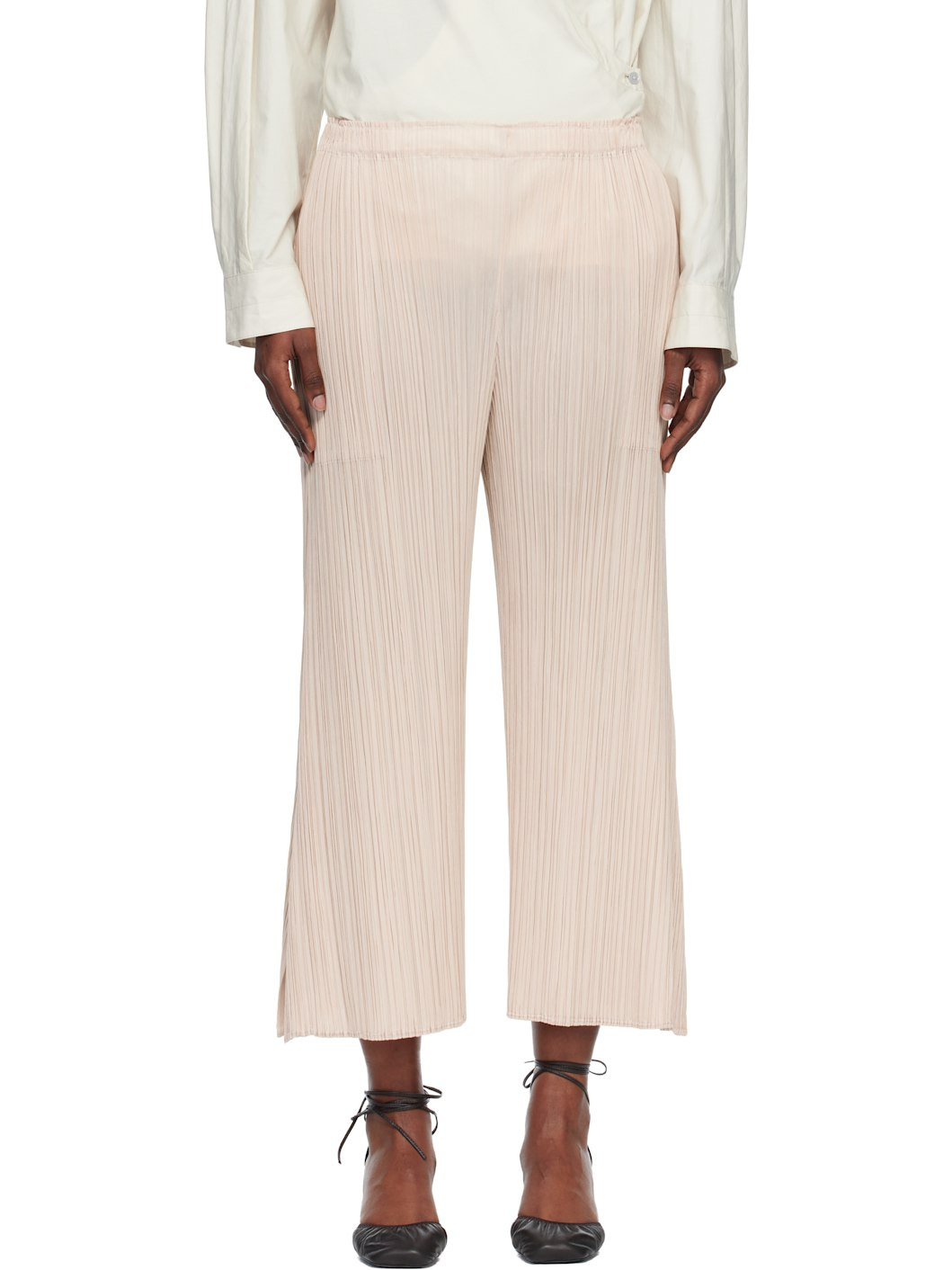 Garment-pleated tricot trousers. · Straight-leg · Elasticized waistband · Two-pocket styling Supplier color: Light beige 100% polyester. Made in Japan 252941F087048