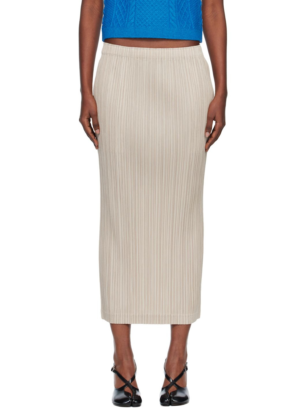 Garment-pleated tricot maxi skirt. · Elasticized waistband · Two-pocket styling Supplier color: Greige 100% polyester. Made in Japan 252941F093007