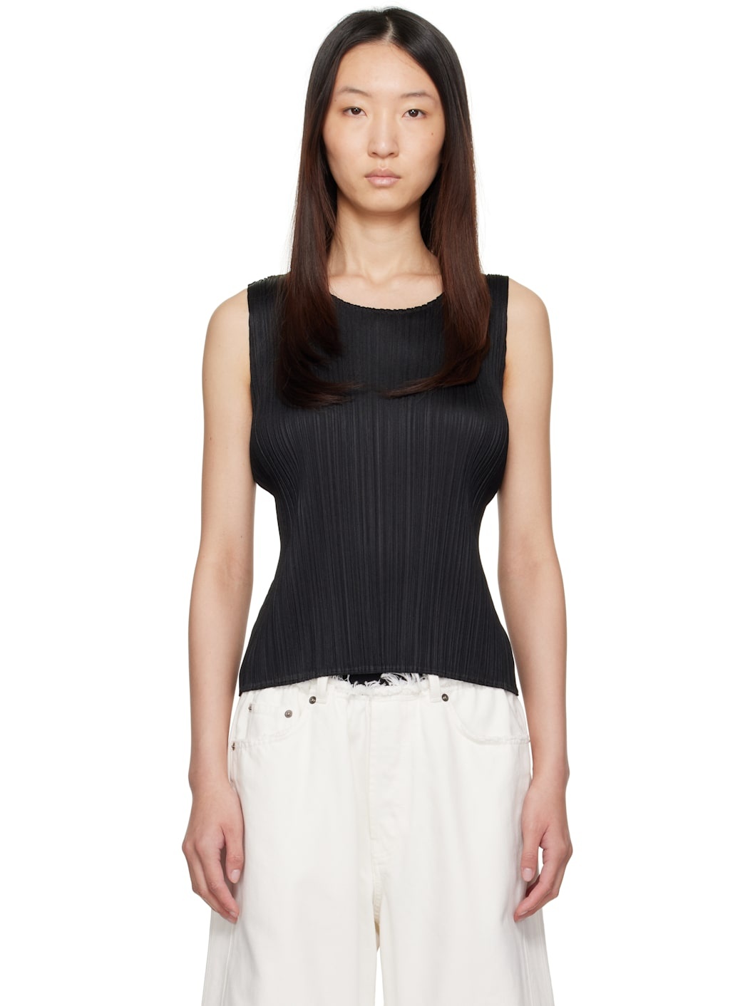 Garment-pleated polyester jersey tank top. Round neck. Supplier color: Black 100% polyester. Made in Japan 251941F111006