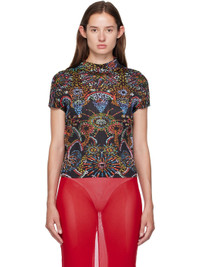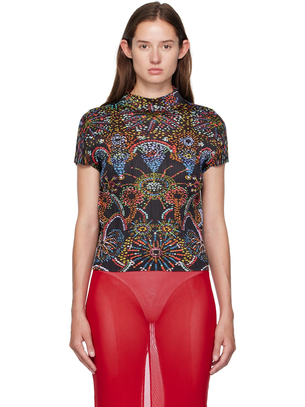 Garment-pleated tricot T-shirt. · Graphic pattern printed throughout · Mock neck · Cap sleeves Supplier color: Black 100% polyester. Made in Japan 252941F099017