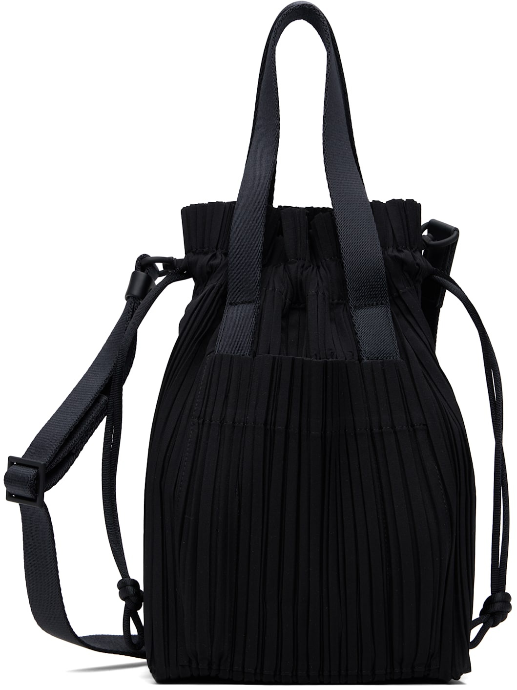 Garment-pleated taffeta tote in black. · Webbing carry handles · Adjustable and detachable webbing crossbody strap · Patch pocket at face and back · Drawstring closure · H9.25" x W6" x D4" Supplier color: Black 100% polyester. Made in Philippines 252941F049000