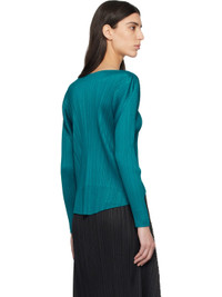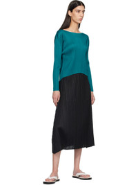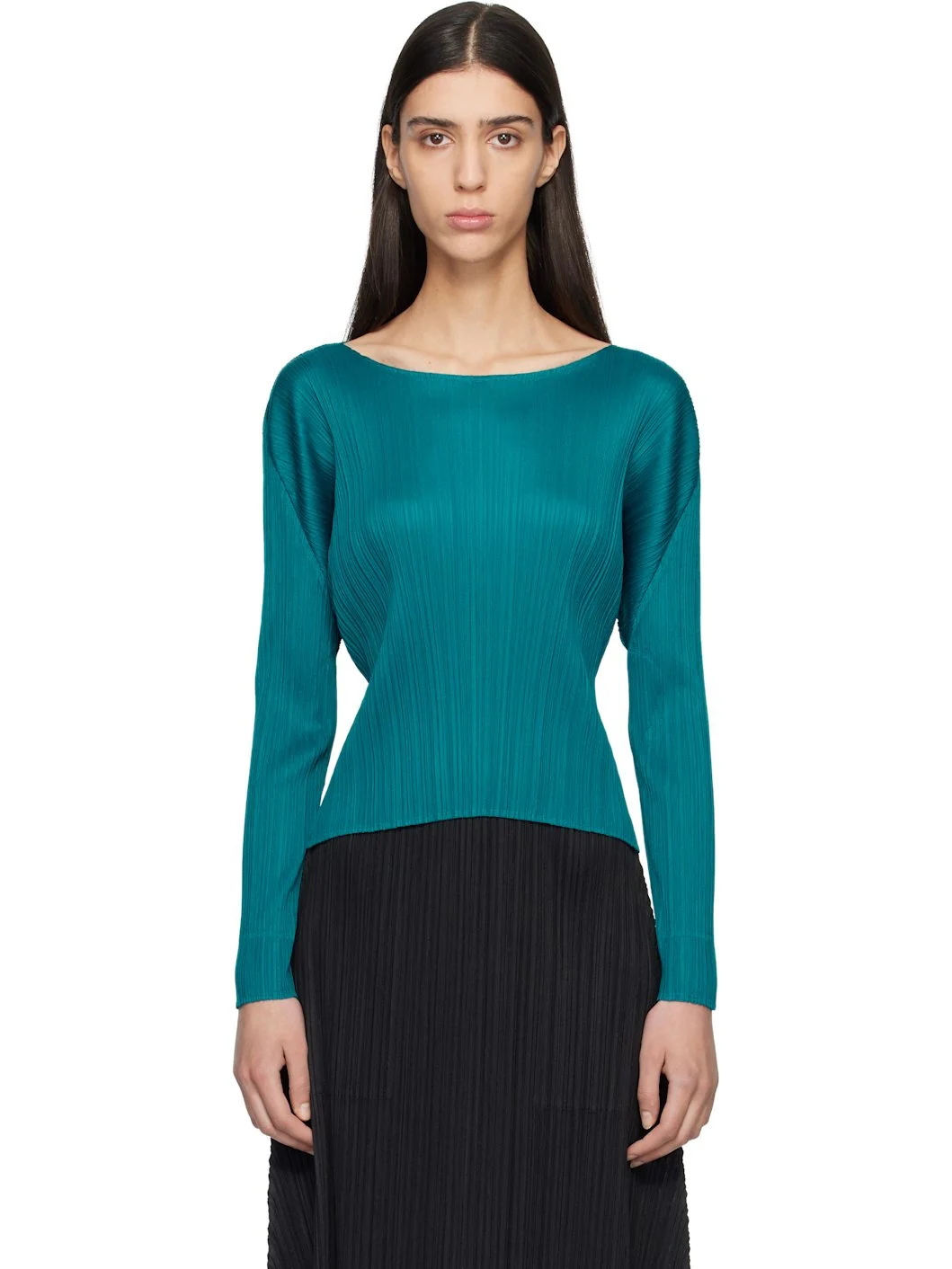 Garment-pleated tricot top. · Round neck · Droptail hem · Dolman sleeves Supplier color: Turquoise Green 100% polyester. Made in Japan 261941F110006