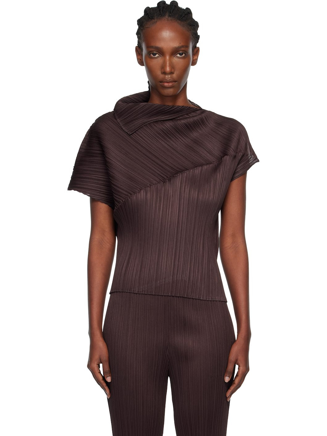 Garment-pleated tricot top. · Foldover neck · Asymmetrical hem and cap sleeves Supplier color: Dark brown 100% polyester. Made in Japan 252941F099031