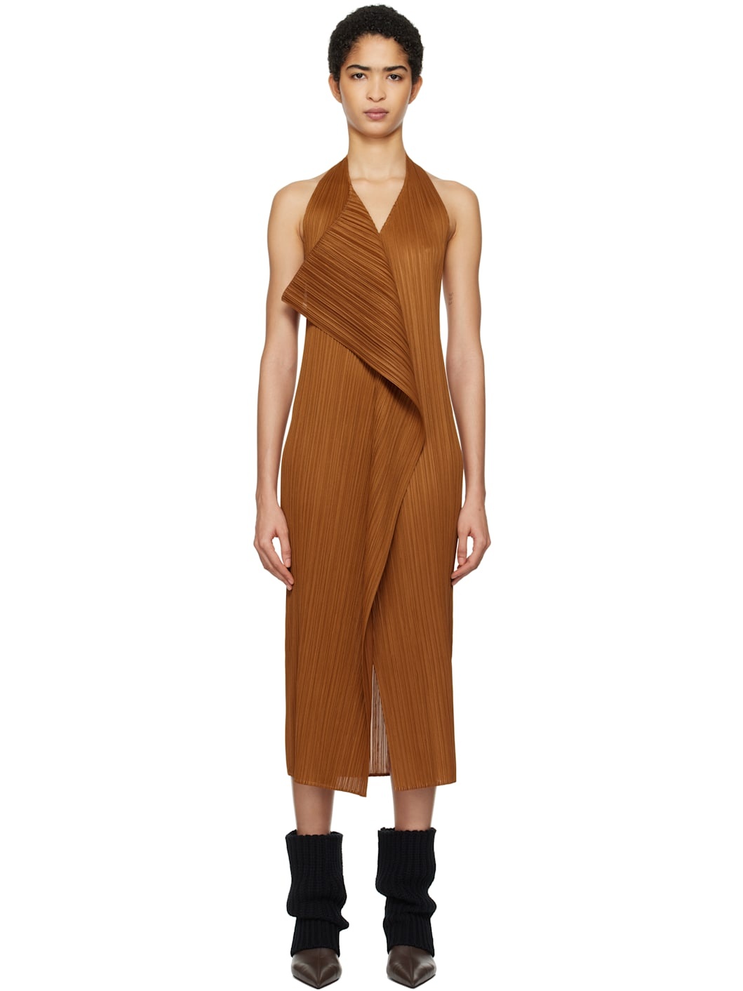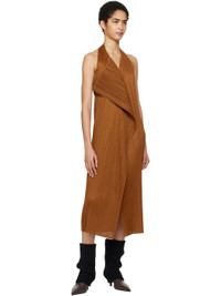 Garment-pleated polyester tricot maxi dress. · V-neck · Extended trim at front · Central vent at front hem · Fixed halter strap · Open back Supplier color: Brown 100% polyester. Made in Japan 251941F055014