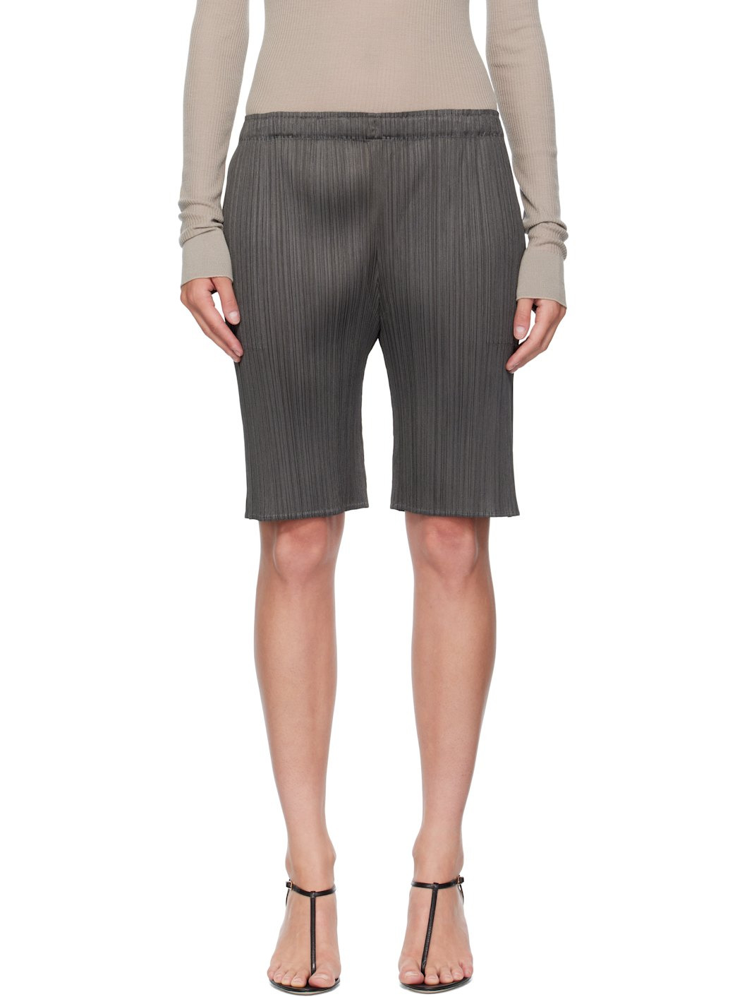 Garment-pleated tricot shorts. · Elasticized waistband · Two-pocket styling Supplier color: Charcoal gray 100% polyester. Made in Japan 252941F088002