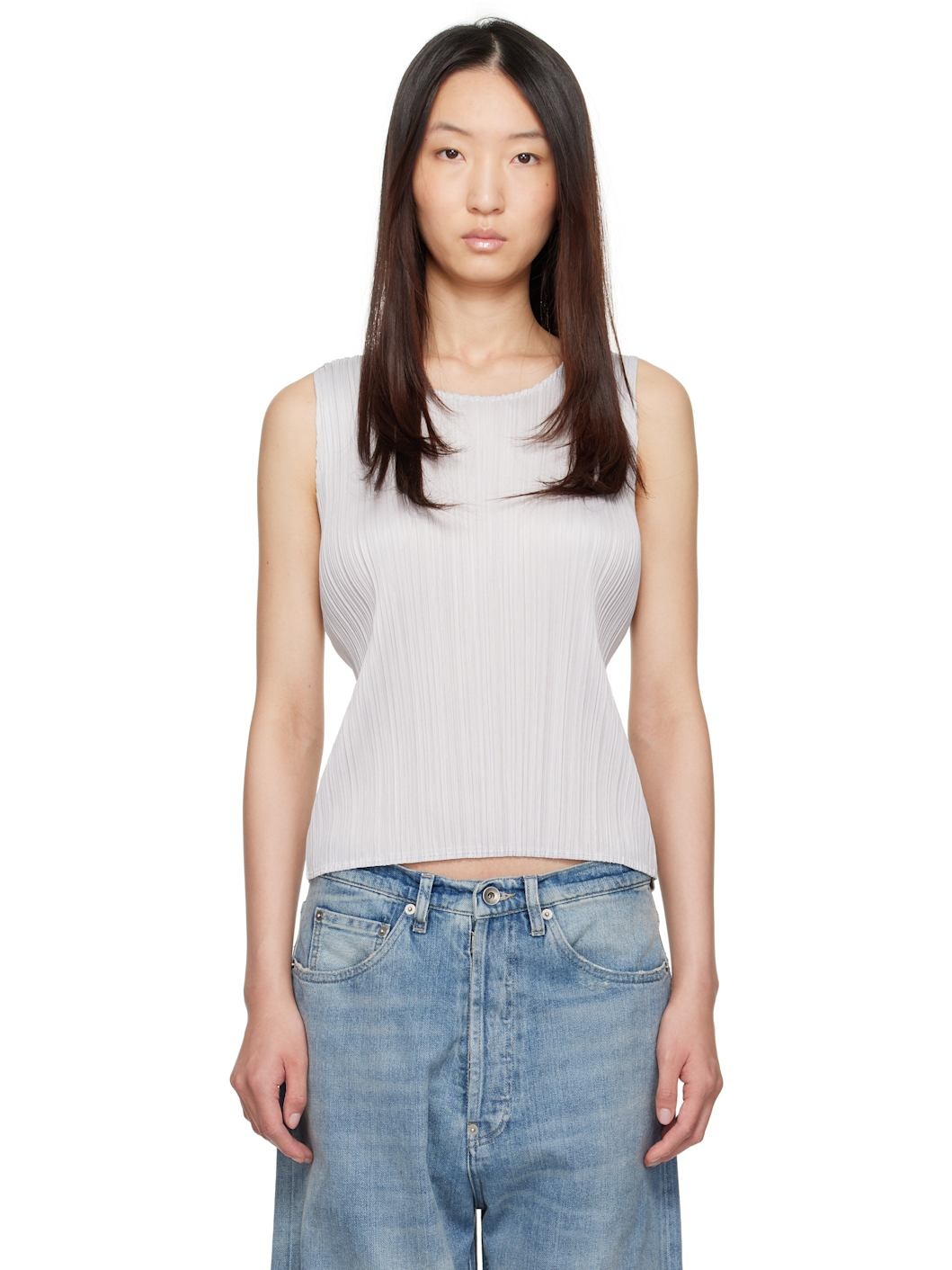 Garment-pleated polyester jersey tank top. Round neck. Supplier color: Light gray 100% polyester. Made in Japan 251941F111005